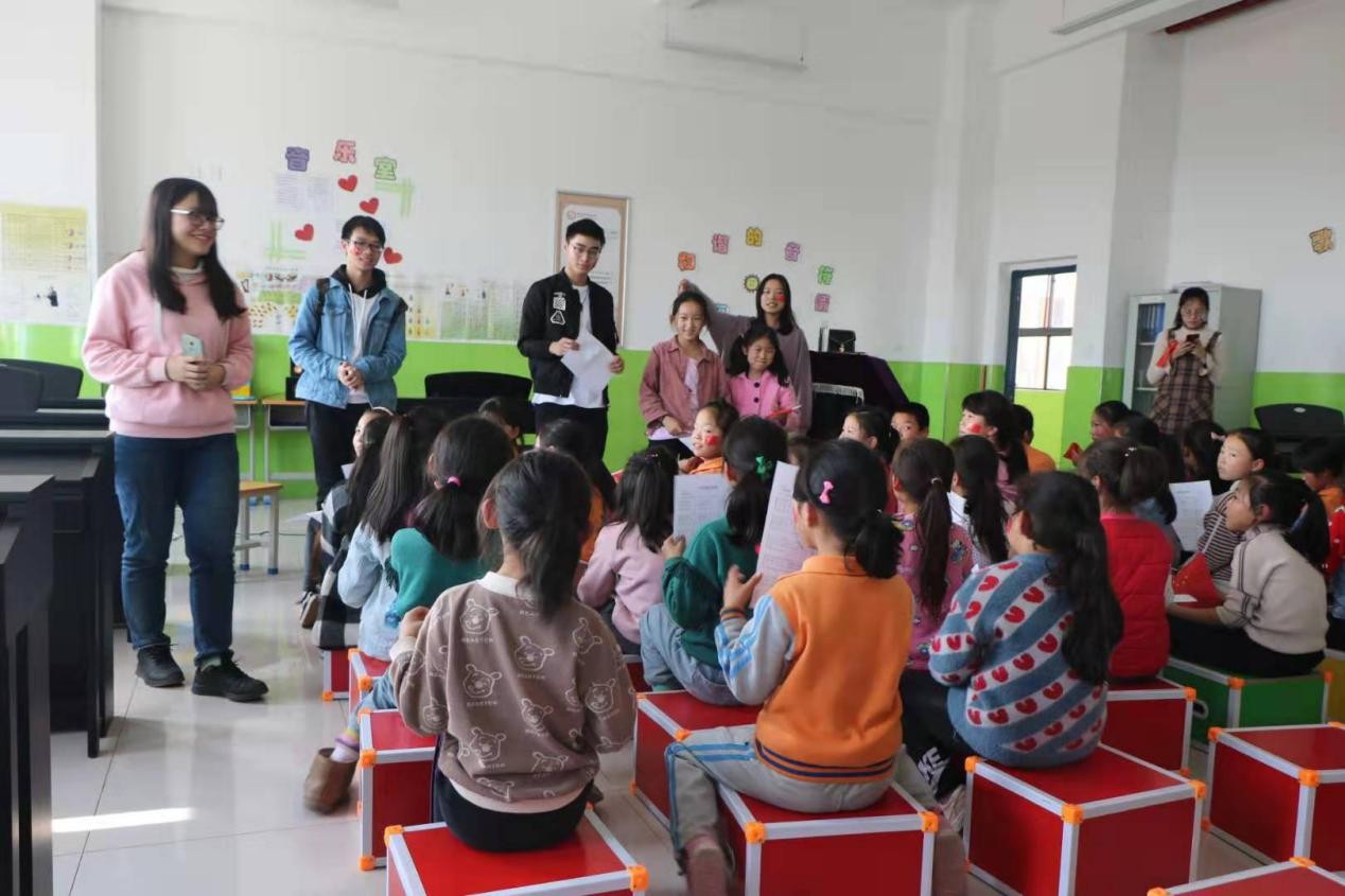 在音乐教室中,孩子们歌唱的声音悦耳悠扬。《我和我的祖国》在今年响彻了大江南北,或许孩子们的音调并不标准,但是他们都在大声歌唱。志愿者们教一句,员工们跟着唱一句,遇到不认识的字,大哥哥大姐姐们便会给予耐心解释。过程中大家互相聊天,轻松愉快。休息时间,志愿者们还给小朋友唱他们喜欢的歌,时而单人独奏,时而多人合唱,音乐室里充满了欢快的气息。