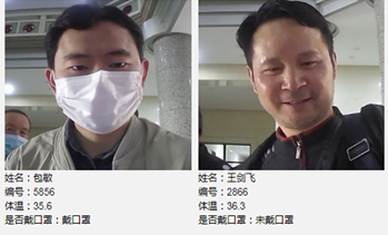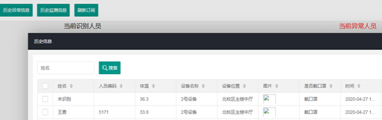 同时能够进行测温、时间、地点和人数统计,及时为相关管理部门推送精准异常信息。可实现有症状人员门禁动态控制,体温状态温馨提醒:低温、正常和高温预警,高温相关责任人报警。部分后台信息如下:
