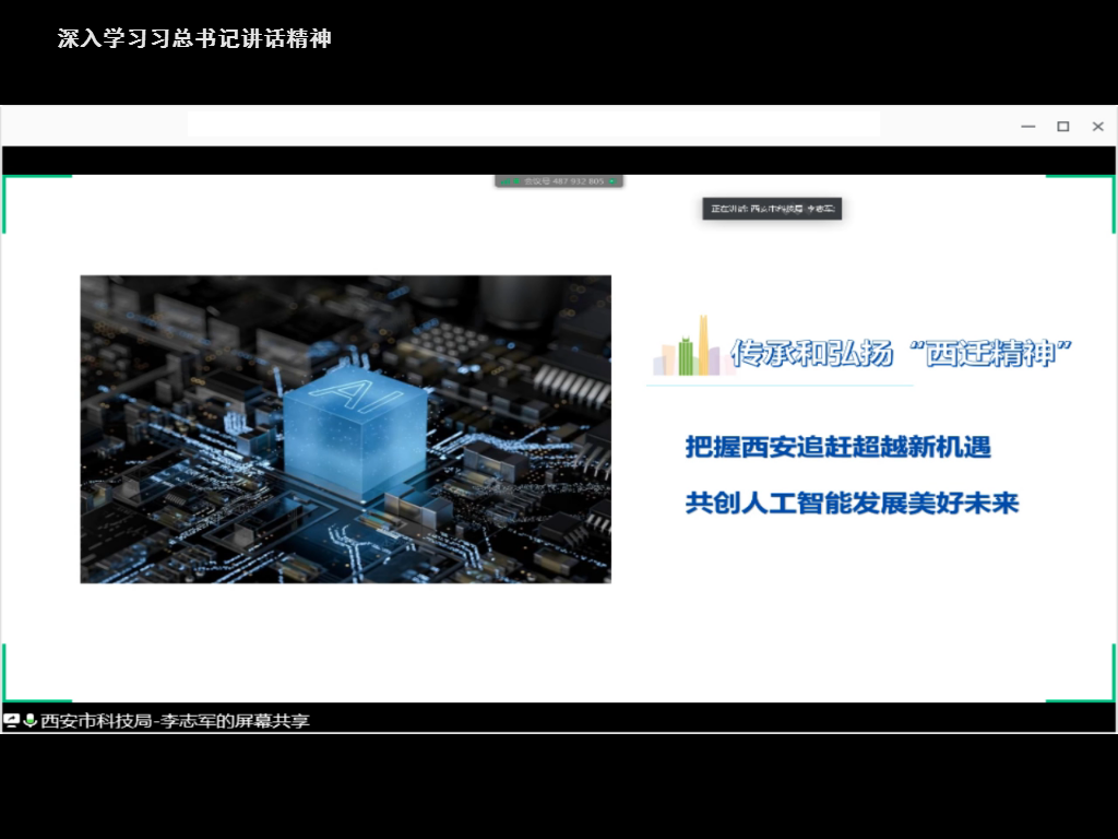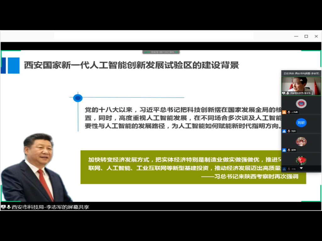 李志军局长介绍了西安市国家新一代人工智能创新发展试验区建设情况,西安人工智能产业发展具有科研实力雄厚、人才优势明显和产业基础良好三点比较优势,在此基础上,西安建设国家新一代人工智能创新发展试验区的总体思路是构建人工智能技术创新体系,促进人工智能产业集聚发展,拓展人工智能融合发展应用示范,创新人工智能人才引培机制,营造人工智能创新发展生态。