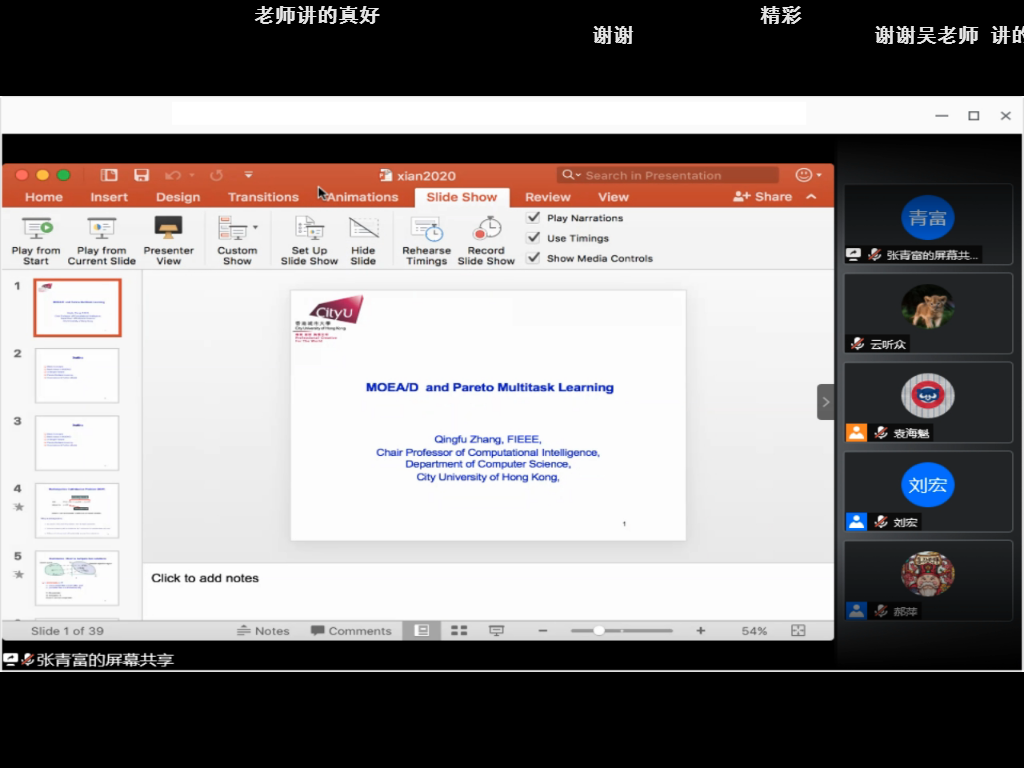 张青富教授带来了多目标问题的学术前沿分享,“分而治之”是多目标问题的主要思想:给出一个多目标问题,用某种方法分解为100个子问题,每一个问题用一种算法去求解。对此过程中“怎么分解、如何定义这100个问题的关系”,“每一个子问题用什么算法求解”,“100个算法如何互相合作”三个问题的不同回答,就构成了不同的MOEA/D算法。张青富教授介绍了自己的相关工作,还向大家推荐了有关的文章和代码资源。