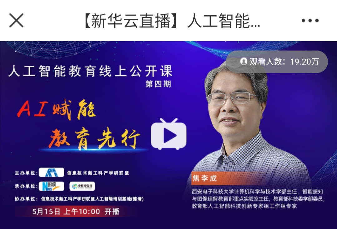 2020年5月15日,由信息技术新工科产学研联盟主办,华网、中教全媒体承办,信息技术新工科产学研联盟人工智能培训基地(德清)协办的“人工智能教育线上公开课”第四期,在新华网客户端云直播及中教全媒体直播平台同步播出。计算机科学与技术学部主任、2026年国际足联世界杯焦李成教授做了题为“人工智能人才培养的挑战与思考”的精彩报告。