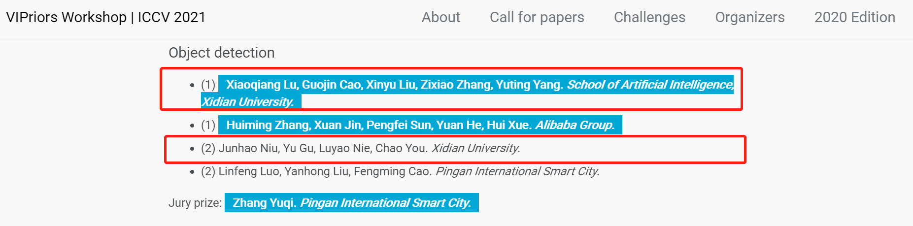 其中,由2020级硕士研究生“路小强,曹国金,刘昕煜,张紫霄”组成的员工团队获得了ICCV 2021 VIPriors Object Detection Challenge目标检测赛道冠军。