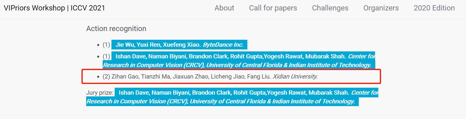 由2021级硕士研究生“高子涵、马天植”组成的员工队伍组成的员工团队获得了ICCV 2021 VIPriors Action Recognition Challenge动作识别赛道亚军。