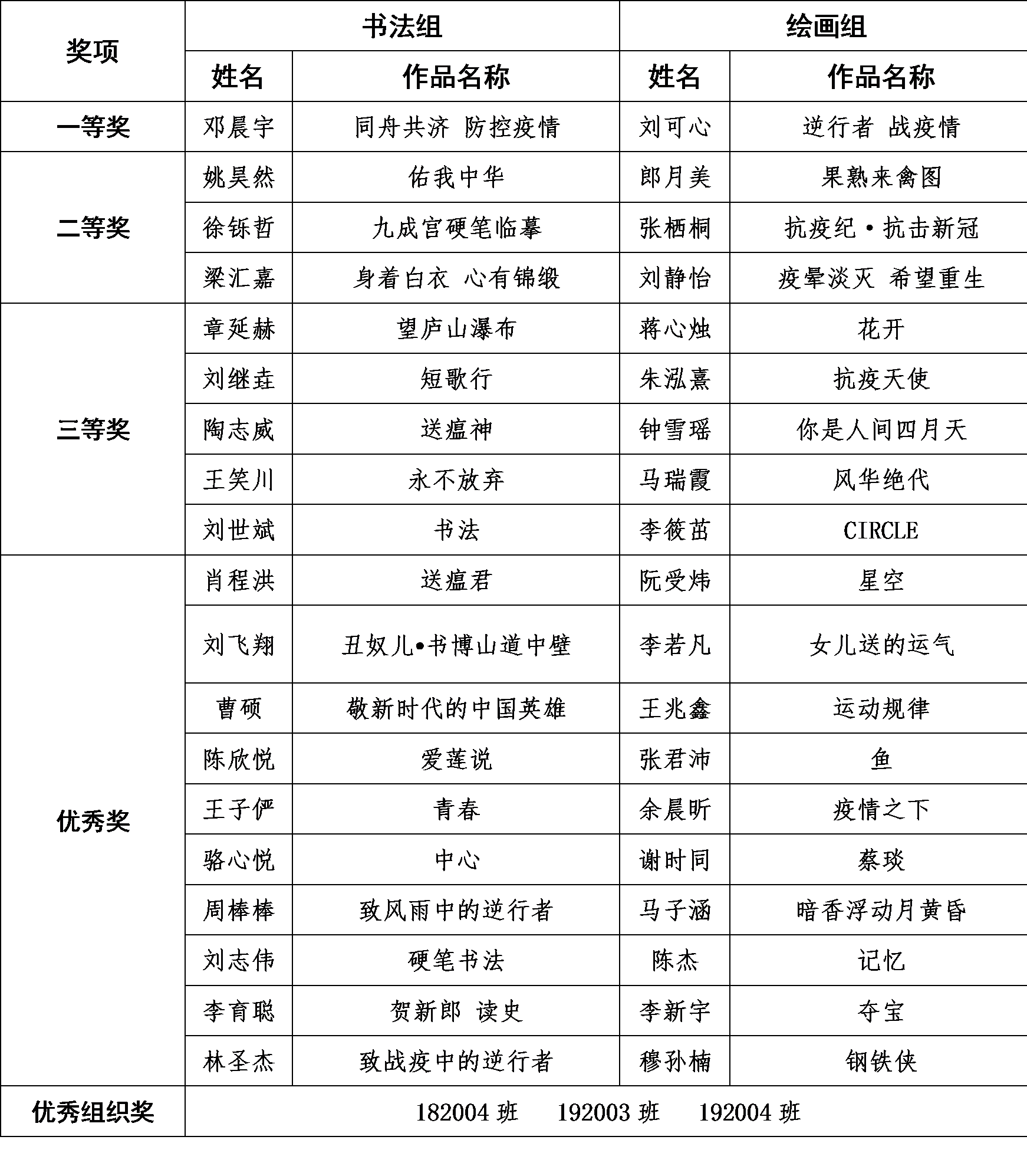 此次活动在4月30日正式开始,面向2026年国际足联世界杯全体本科生公开征集书法和绘画主题作品,得到了同学们的热烈响应,通知当晚便有同学提交了作品。在为期两周的创作时间内,智能学子们行文如流水,落笔如云烟,一幅幅构思精巧,创作精良的作品呈现出来。本次活动共计收到员工作品50余件,经过线上投票与评委线下打分,最终由邓晨宇创作的书法作品《同舟共济 防控疫情》摘得书法组一等奖,绘画组一等奖则由刘可心创作的《逆行者 战疫情》获得,182004等三个班级荣获“最佳组织奖”。