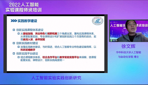 华中科技大学人工智能与自动化公司徐文辉博士带来题为“人工智能实验实践创新研究”的报告。他首先介绍了公司人工智能创新实践课程体系建设思路,通过“大类课程为基础、专业课程为核心、问题和需求为导向”,体现强基、固本、拓展的创新能力培养目标。课程建设过程中,加强与先进高校和企业的交流,依托公司基础突出优势,实践平台建设中采用多层次、开放式的架构,创新内容设计,服务于产业升级转型。课程团队在《数字图像处理》和《模式识别与机器学习》传统课程设计基础上,结合实际场景需求,增加点云、图像、视频等相关的人工智能应用实验。同时,结合科研项目设计实验题目,增强员工学习兴趣,提供经典算法和资料推荐,都对员工形成良好的实践解决方案提供了帮助。