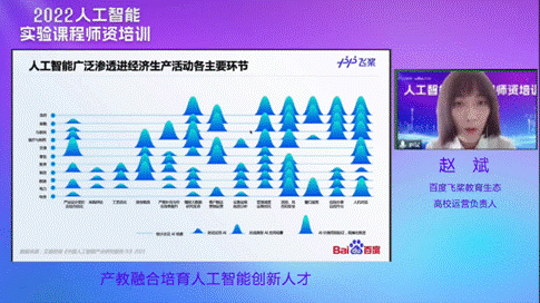百度飞桨教育生态高校运营负责人赵斌做了题为“产教融合培育人工智能创新人才”的分享。她首先介绍了百度飞桨的建设初衷和发展历程,目前飞桨具有便捷的深度学习框架、超大规模的深度学习模型训练技术、多端多平台部署的高性能推理引擎、产业级开源模型库等,得到了高校和企业的广泛应用和认可。结合人工智能人才需求大、学科交叉性强、与产业结合紧密等特点,百度飞桨以员工实践能力和综合素质培养为目标,促进校企共同体建设,构建产教融合的人才培养体系,包括多适配性的课程体系及立体化教学资源、海量数据集和案例库、丰富的师生服务等,有效助力高校人才培养。