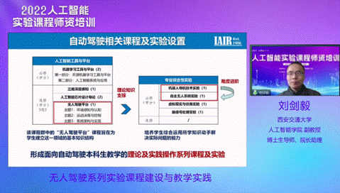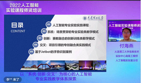 大连理工大学人工智能实验室主任付海燕老师带来“以“系统·创新·交叉”为核心的人工智能专业实践教学体系探索”。她从公司人工智能专业实验实践课程体系设置、专业实验类教学模式设计、实验案例实施情况等方面做了分享。在实验课程设计过程中通过多场景贯穿、赛教融合、科研项目融入等方式,保证了实验内容很好地服务于人工智能人才实践能力培养,在学科竞赛中取得了优秀成绩。精彩的案例分享中,实验设计、课程思政、专业教育与家国情怀培育同向同行等内容,为高校人工智能实践教学提供了良好启发。