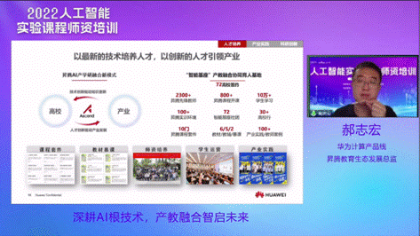 华为计算产品线昇腾教育生态发展总监郝志宏做题为“深耕AI根技术,产教融合智启未来”主题报告。他首先介绍了华为在前期昇腾人工智能教育生态方面的工作基础,以及对相关专业人才培养提供的支撑作用。校企共同梳理人工智能核心课程,围绕实验以最新的技术服务高校实践教学环节,通过产教协同创新人才培养引领产业发展。他表示,企业后续将继续促进产业实际案例融入,共同开展实验课程团队培训,丰富教学资源设计和平台搭建,与高校共同赋能人工智能高层次人才培养。