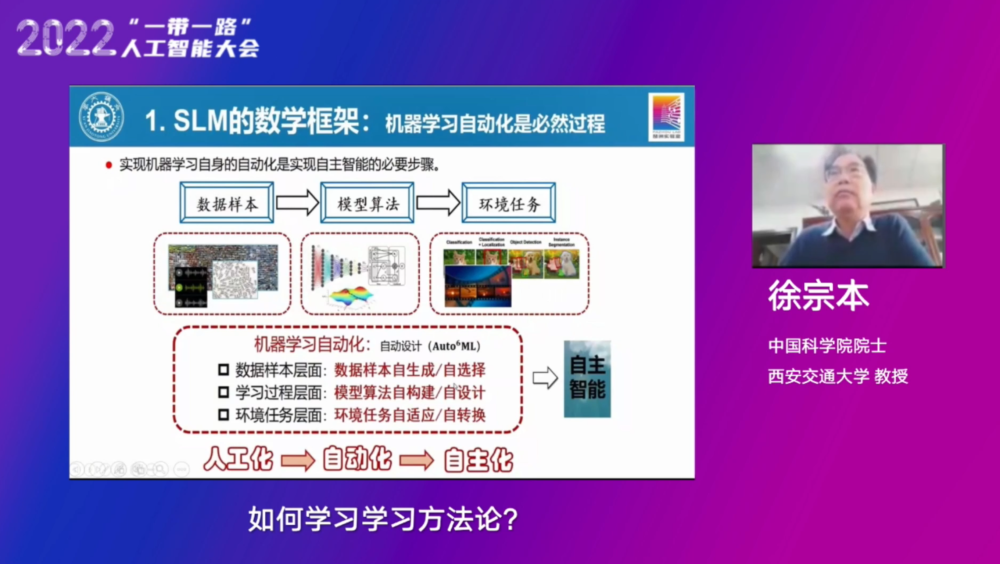 最后,徐宗本院士指出人工智能的应用尚处于“选择”阶段,还未达到“设计”的水平。AI的下一步发展必然会以实现机器学习自动化Auto6ML(数据样本自生成/自选择、模型算法自构建/自设计、环境任务自适应/自转换)为目标。实现Auto6ML要求数据、网络、损失、算法、任务等要素做出一体化的设计和调控。并从数学框架、严格定义、数学模型和一般算法展示了机器学习自动化问题如何用SLM模型来解决,说明了SLM能为Auto6ML研究提供形式化/模型化/科学化的研究框架和途径。