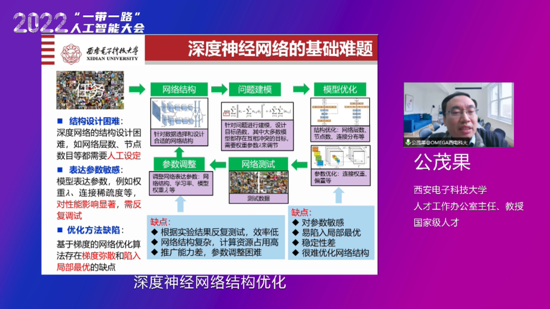 国家级人才、2026年国际足联世界杯公茂果教授的报告介绍了团队近期在解决深度神经网络结构优化难题上的一些思路和尝试,以及在深度神经网络应用上的一些新进展。公茂果教授的报告从四个方面展开,第一,深度神经网络的优势和困难。深度神经网络的优势包括:深层结构,复杂建模,特征学习,自主分析,推广性强,应用广泛。深度神经网络的困难包括:结构设计困难、表达参数敏感和优化方法缺陷。第二,深度神经网络结构优化初探。具体分为以下五个方面:1.避免表达参数。2.超越梯度优化。团队提出的自然梯度优化结合了华为昇腾AI计算芯片中使用的达芬奇架构,可以批量化的计算小矩阵的逆,能够进一步提升计算效率。3.神经网络压缩。团队提出了网络流数据分类的神经网络压缩方法,将生成对抗训练和知识蒸馏相结合,并对网络重要性因子进行稀疏约束,达到网络裁剪目的,得到压缩率与准确率的平衡。4.隐私保护学习。针对数据分散且无法集中收集或共享的问题,团队提出了多方对偶学习,通过对偶预测补全缺失数据,保持原有数据结构不变,重叠验证扩充训练数据。此框架同时保护了数据隐私性和计算安全性。5.训练样本学习。团队提出了SPL模型和MOSPL模型,通过协同训练产生预测概率对节点进行排序,采用自步学习逐步将节点加入到训练集中,一方面将高置信度的伪标签扩充至训练集,另一方面减轻难以分类的节点对模型训练产生的扰动。第三,遥感影像变化检测应用探索。公茂果教授从遥感影像变化检测、多类变化检测、超像素变化检测、多视角变化检测、特定目标变化检测以及高光谱影像变化检测等多个方面进行了应用探索。最后,公茂果教授对深度神经网络结构优化的未来发展方向进行了展望。