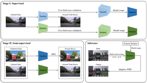 亚军方案:队伍提出一种两阶段自训练教师-员工框架,使用一个两阶段检测器作为教师模型为单阶段检测器的员工模型提供多样性的伪监督信号。在第一阶段,通过集成学习与模型融合Model Soups构建了鲁棒的教师、员工模型。在第二阶段,教师模型通过可靠的伪标签生成策略为员工模型提供高质量的伪监督信号。在推理阶段,队伍设计一种有效的后处理流程,由多尺度测试、Model Soups以及自适应加权框融合构成。队伍突破了基于自训练的半监督学习范式的关键技术,实现了自动驾驶技术中道路目标对象检测精度的显著提升。