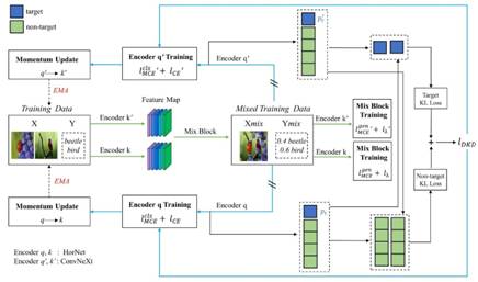 亚军方案:队伍提出一种具有交叉解耦知识蒸馏的双支教学方案,突破了少样本图像分类数据增强与知识蒸馏的关键技术,实现了在有限数据下提升分类器识别与抗噪性能。该方案从数据端引入AutoMix样本混合策略实现样本分布多样性以及特征端引入交叉解耦知识蒸馏算法实现模型知识多样性两方面来提升分类器的识别能力。基础分类器使用HorNet以及ConvNeXt,在训练过程中两个模型互为老师以及员工两个身份。然后对训练好的模型先使用Model Soups进行模型集成,再使用测试增强进行推理,最后使用少数服从多数的投票策略进行结果融合获取最终分类输出。