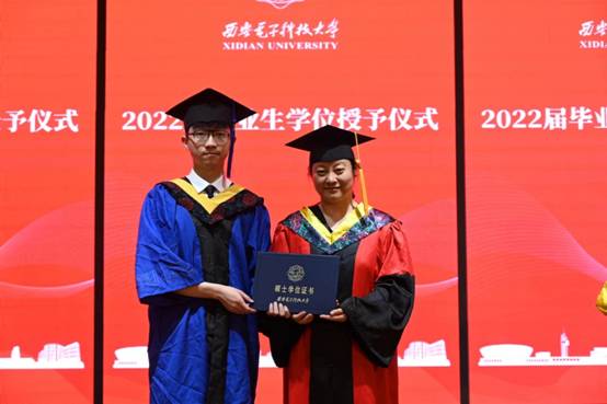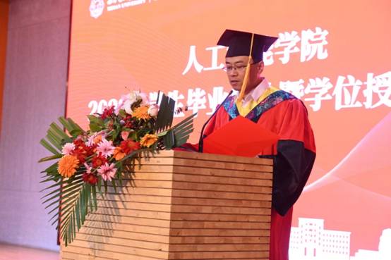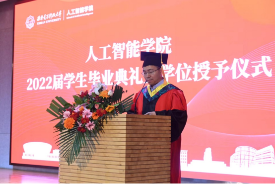 优秀毕业生代表邵奕霖在发言中首先感谢公司的照顾与培养、感谢老师的传道授业解惑,为同学们的学习生活保驾护航、遮风挡雨。他号召毕业生以国家发展、社会进步、人民幸福和人类福祉为先,将勇闯“无人区”,敢做“领头雁”的精神继续传承下去, 在新一代人工智能快速发展中贡献西电智慧。