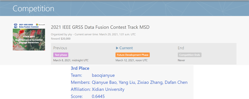 2020 IEEE GARSS数据融合竞赛中,在焦李成教授、刘芳教授、屈嵘教授的指导下,研究生尹淑婷、陈大帆、马成聪慧、连彦超组成的队伍获得了“低分辨率和高分辨率标签的土地覆盖分类赛道”的季军。