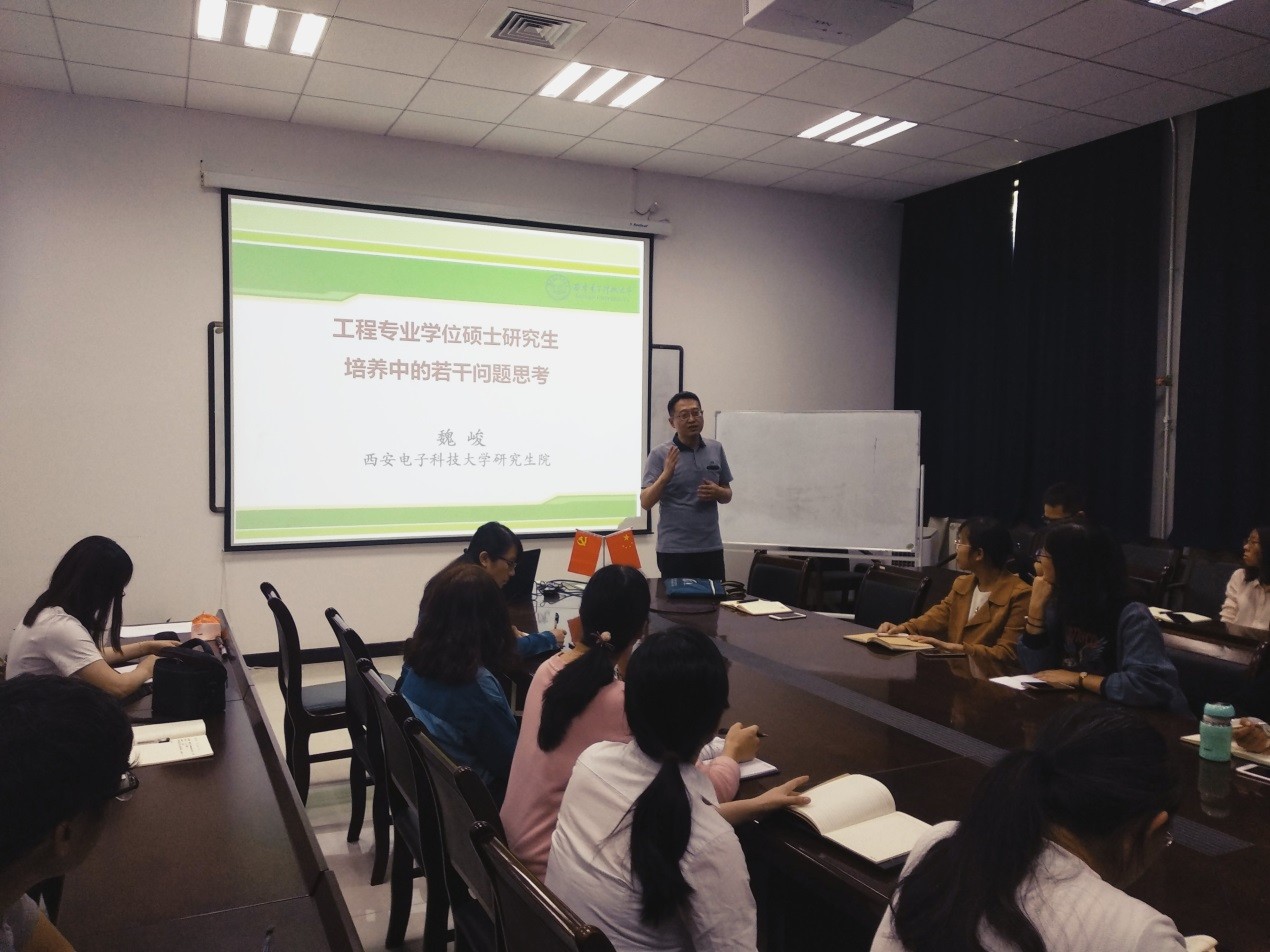 之后开展了支部教师党员本领提升计划的培训,魏峻书记以《工程专业学位硕士公司产品若干问题的思考》为主题对支部党员开展了针对工程专业硕士的专项培训。他从培养目标、培养现状与培养模式方面分析了当前工程专业学位硕士培养方式存在的问题与不足,要求大家明晰工程学位硕士的培养定位,更好地服务于工程硕士研究生的职业发展需求和社会多元化人才需求。