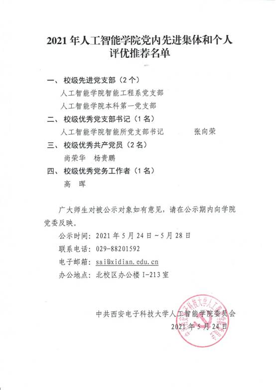 按照公司党委《关于做好2021年度党内先进集体和个人评选表彰工作的通知》(西电党组〔2021〕16号)要求和公司工作安排,经各支部酝酿推荐,公司党委会集体研究,2021年度公司党内评优拟推荐名单如下,现按照有关规定予以公示。