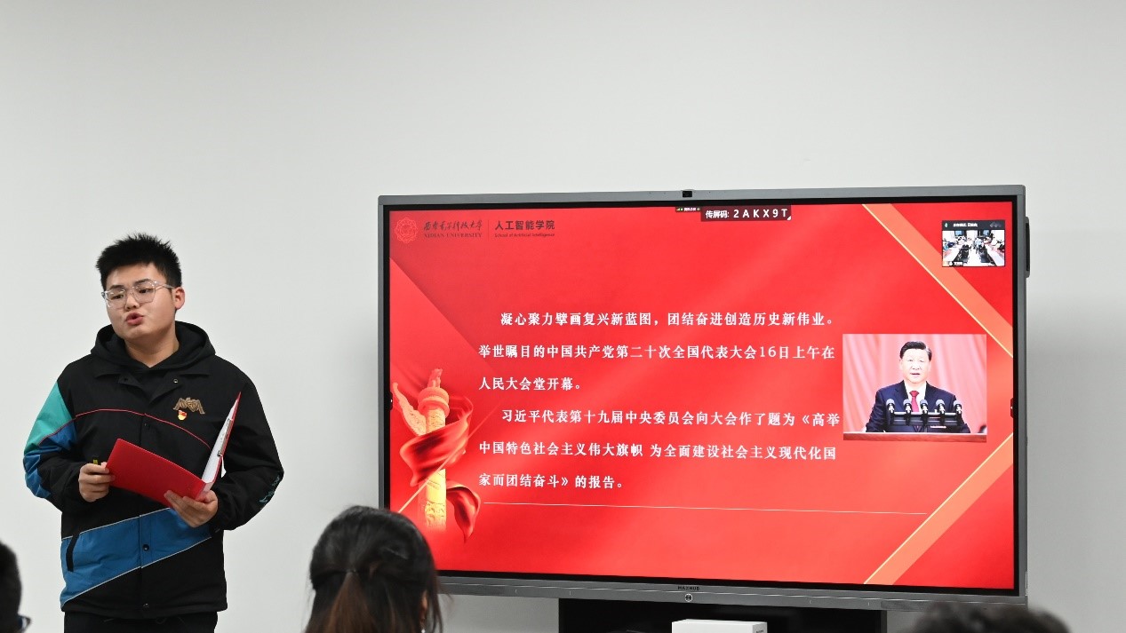 支部大会以习近平总书记的金句集锦视频拉开帷幕。“自信自强、守正创新,踔厉奋发、勇毅前行”“确保中国人的饭碗牢牢端在自己手中”“动员全体中华儿女围绕实现中华民族伟大复兴中国梦一起来想、一起来干”……习近平总书记的话语鼓舞人心、催人奋进,引领青年人践行初心、担当使命。随后,支部党员王骏华同志立足青年党员和西电智能学子的身份,以“生逢其时,大有可为”为题,进行了声情并茂的主题演讲,他号召大家:“我们要提升原始创新能力,矢力实现关键核心技术突破,做好新时代‘科学的千里眼、顺风耳’,努力把发展科技第一生产力、培养人才第一资源、增强创新第一动力更好结合起来,为实现中华民族伟大复兴的中国梦做出更大的西电贡献。”