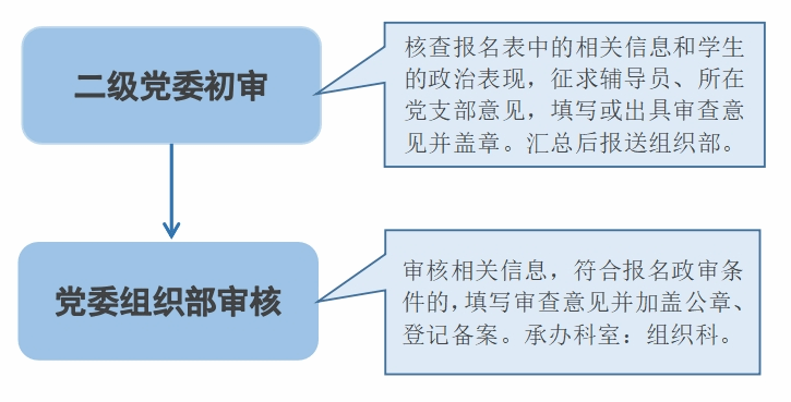 2.党委组织部审核。组织部根据二级党委审查意见,审核相关信息,符合报名政审条件的,填写审查意见并加盖公章、登记备案。承办科室:组织科。