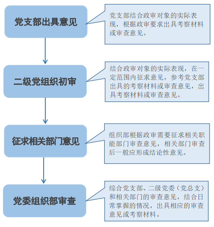 4.党委组织部审查。组织部综合党支部、二级党委(党总支)和相关部门的审查意见,结合日常掌握的情况,出具相应的审查意见或考察材料。